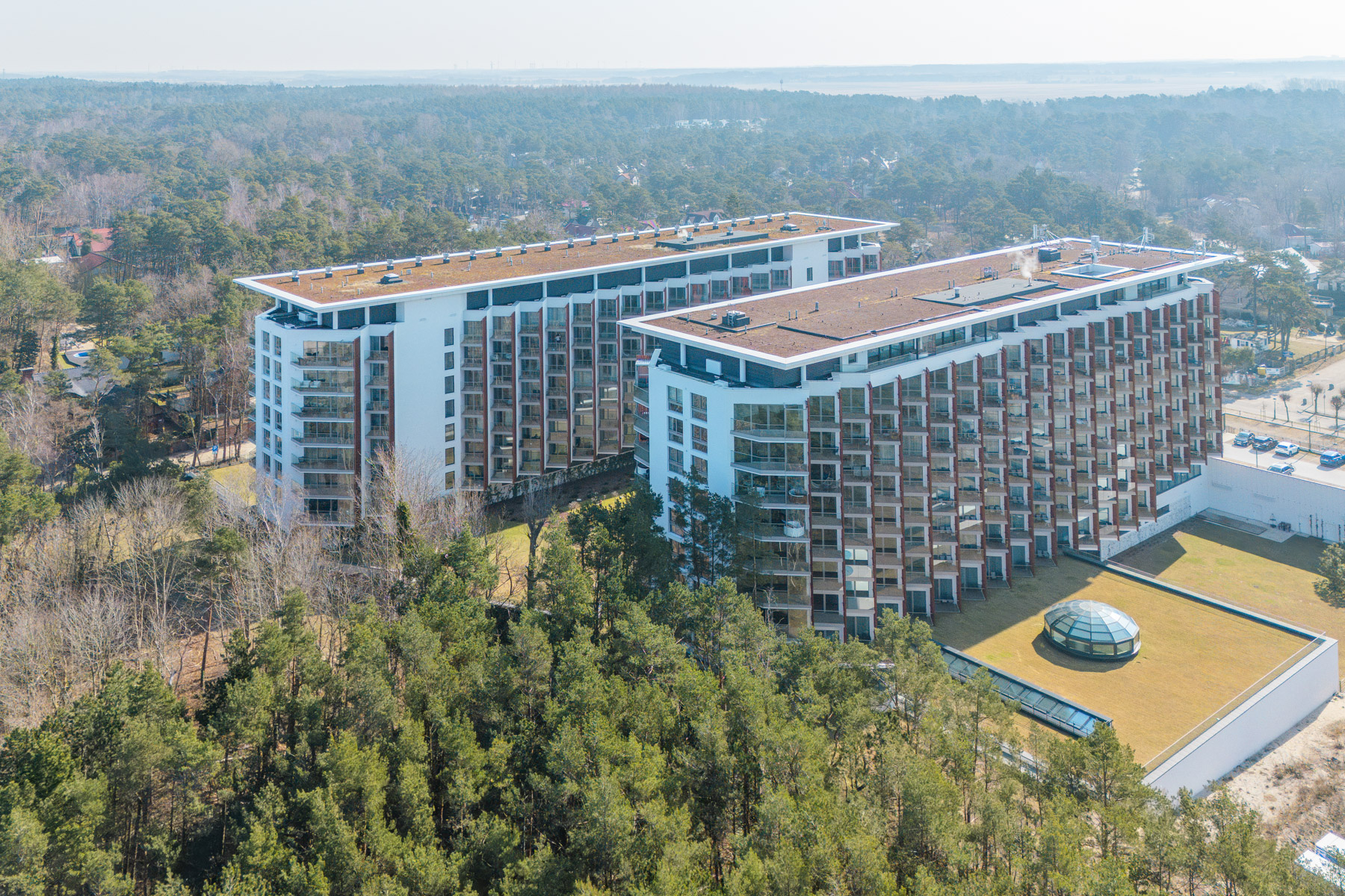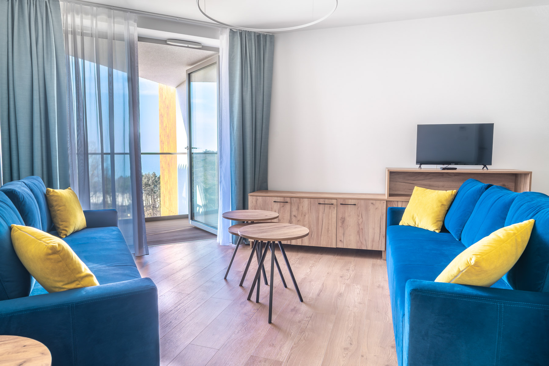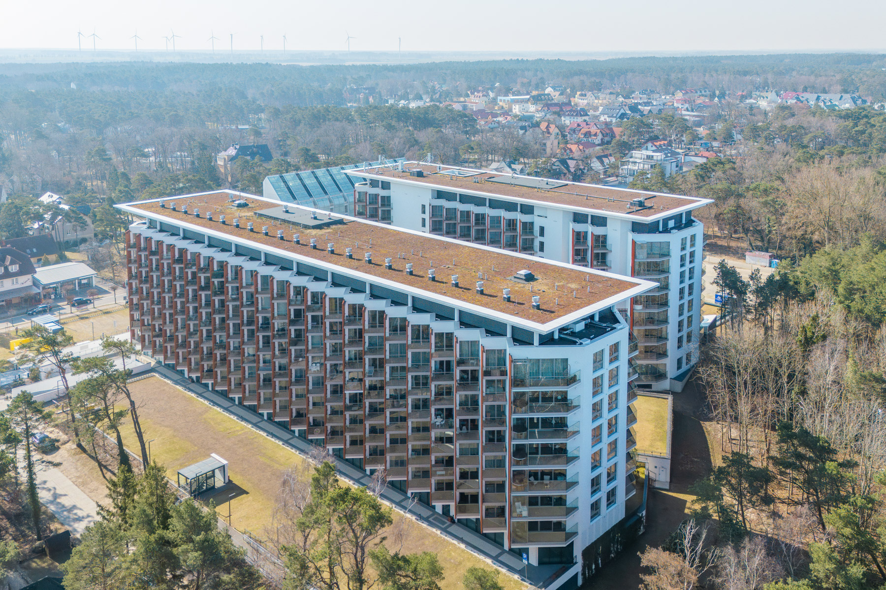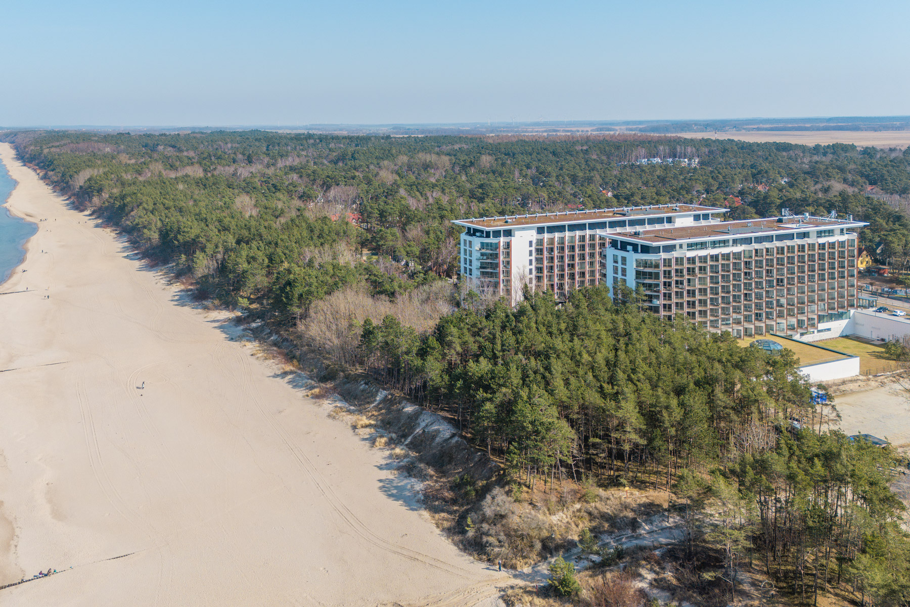 Apartamenty wyróżniają się nowoczesnym designem, przestronnością oraz wysokim standardem wykończenia. Każdy z nich wyposażony jest w aneks kuchenny, komfortową łazienkę, klimatyzację oraz balkon – często z widokiem na morze lub sosnowy las.